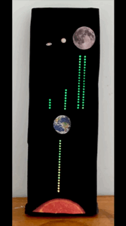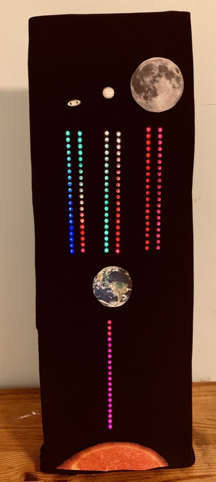 And, not visible behind the Moon, Jupiter, and Saturn, are 9 pixels to light them up (right now they show the light that has arrived at the celestial body). I’m still figuring how to make those more visible. Perhaps changing the representation of the bodies (currently paper cutouts). And, no, there are no pixels for the Earth or Sun. Just didn’t do those.