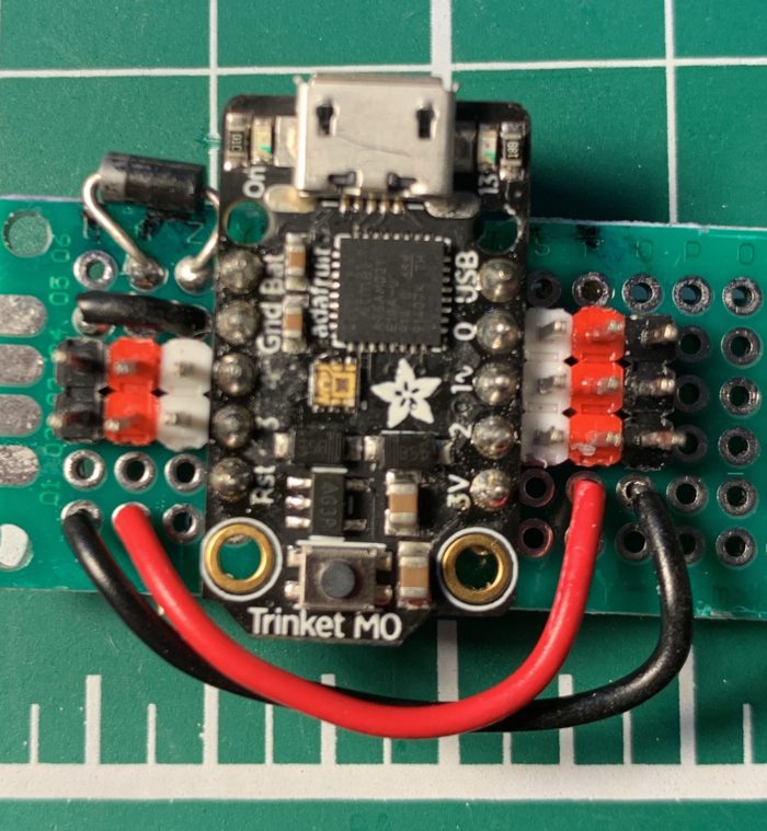 The Trinket is mounted on a perfboard. And there are headers to plug in the Neopixel strips. I decided to give the Neopixel strips connectors, so I can plug and unplug them. Easier to mount and manage and debug.