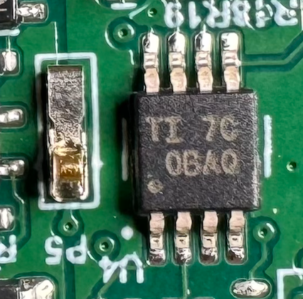 Right next to the clips for the leads (next to two large resistors) is a chip with TI 86 I333. This chips seems to be an INA to convert voltages into data.