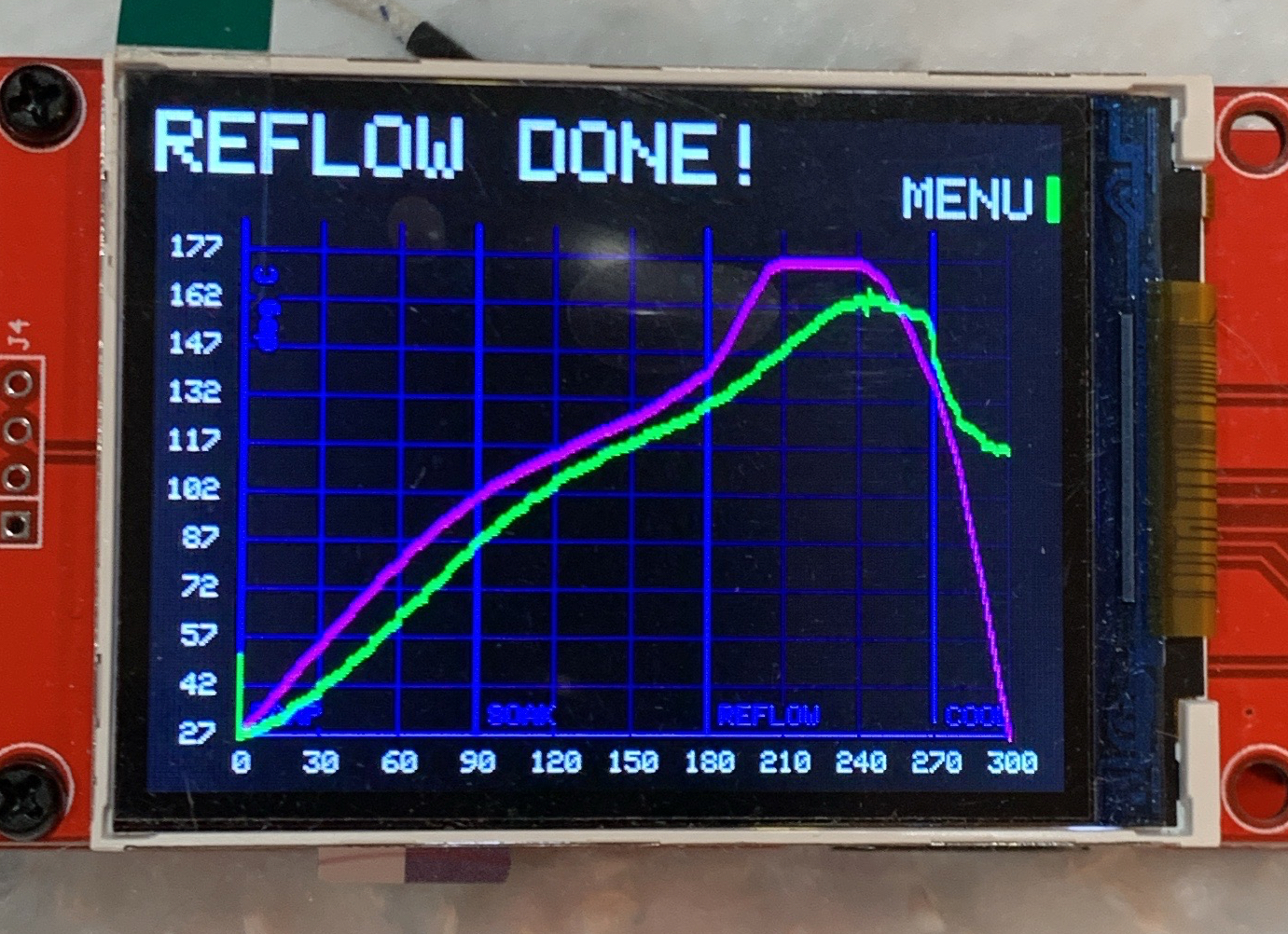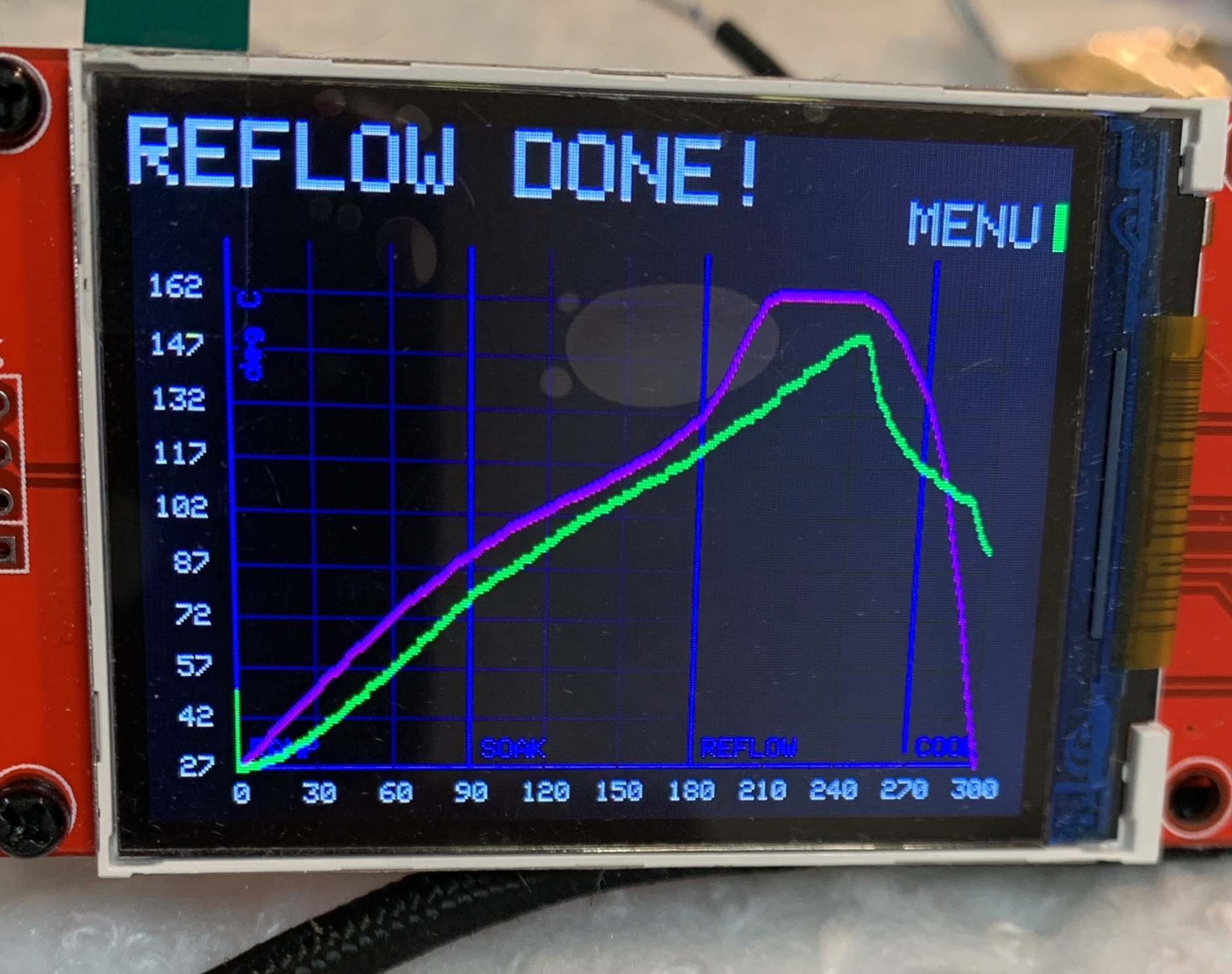 Worked. Now, even though (left below) the pink measured temp don’t match the green desired temps, I am hitting the right temps for my reflow.