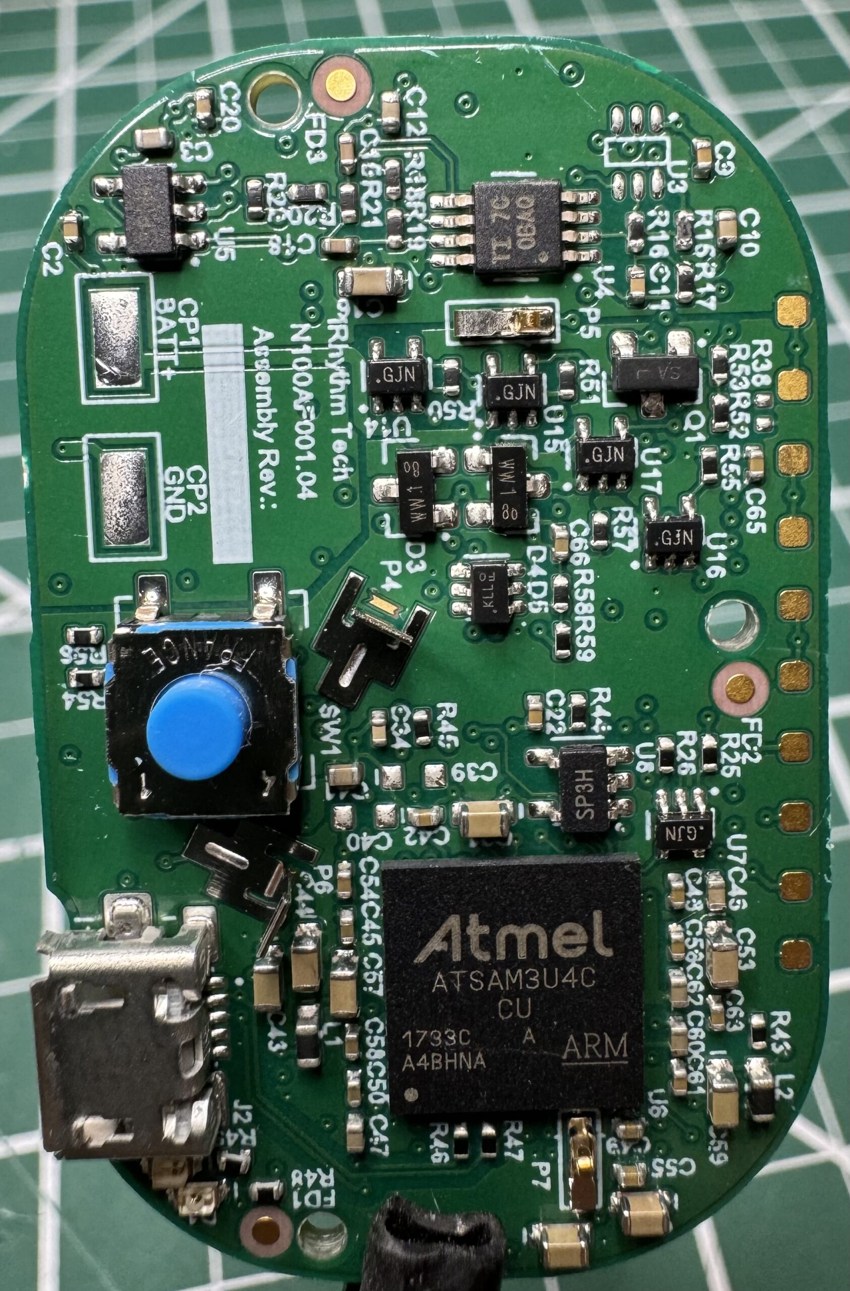 And that’s a big blue button. The cover, shown earlier, flexes to click the button. This is the logging button that the user presses (when they feel an event?). Makes sense that it’s big and sturdy.