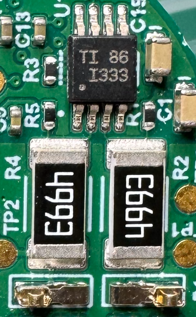 Right next to the clips for the leads (next to two large resistors) is a chip with TI 86 I333. This chips seems to be an INA to convert voltages into data.